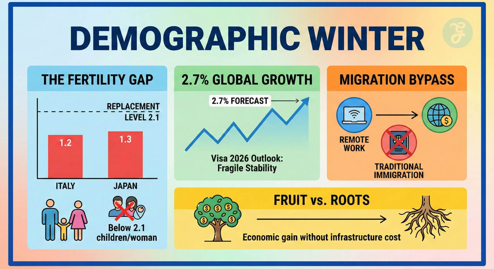 The urgency behind these visas is not about tourism; it is about survival. As we move through 2026, the global economy is grappling with a “demographic winter.” Birth rates in the West and East Asia have chilled. In nations like Italy and Japan, fertility rates have dipped below 1.5, creating a void in the local workforce that traditional migration cannot fix fast enough.