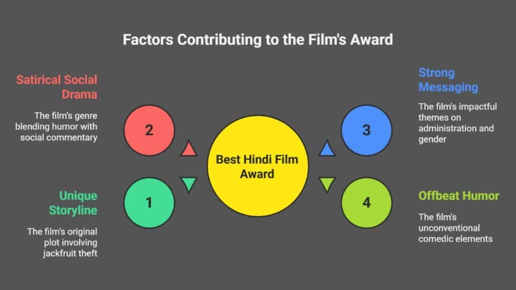 The award for Best Hindi Feature Film went to the satirical social drama ‘Kathal: A Jackfruit Mystery’, starring Sanya Malhotra and directed by Yashowardhan Mishra. The Netflix original film offers a unique storyline about a police officer investigating the theft of jackfruits in a small town, which gradually exposes the underlying rot in rural administration and gender dynamics. Its offbeat humor and strong messaging won over the National Award jury.