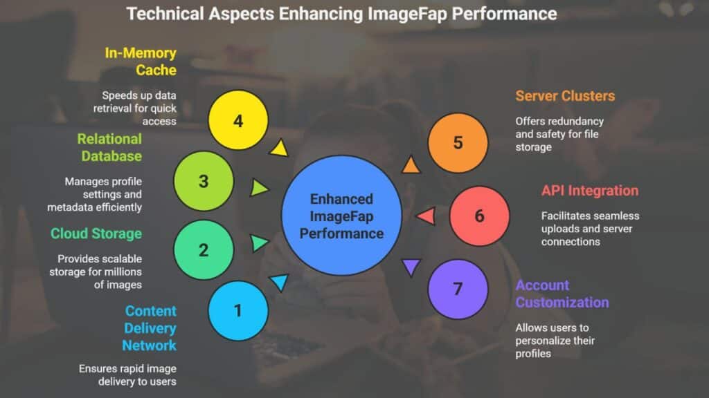 ImageFap taps a content delivery network and cloud storage so your pics race to your screen. A relational database and in-memory cache keep profile settings and metadata humming along.