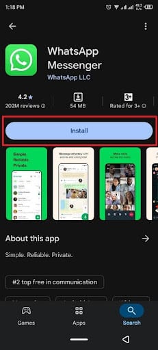 Step 2. Subsequently, access the “WhatsApp” app on your Play Store and press the “Install” button.