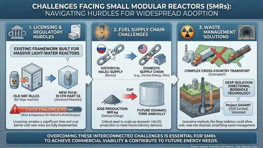 The existing regulatory framework was built for massive light-water reactors, not small modular ones. The U.S. NRC is finalizing a new rule, 10 CFR Part 53, specifically for advanced reactors. Until this is fully implemented and tested, licensing remains a slow and expensive process for first-of-a-kind designs.