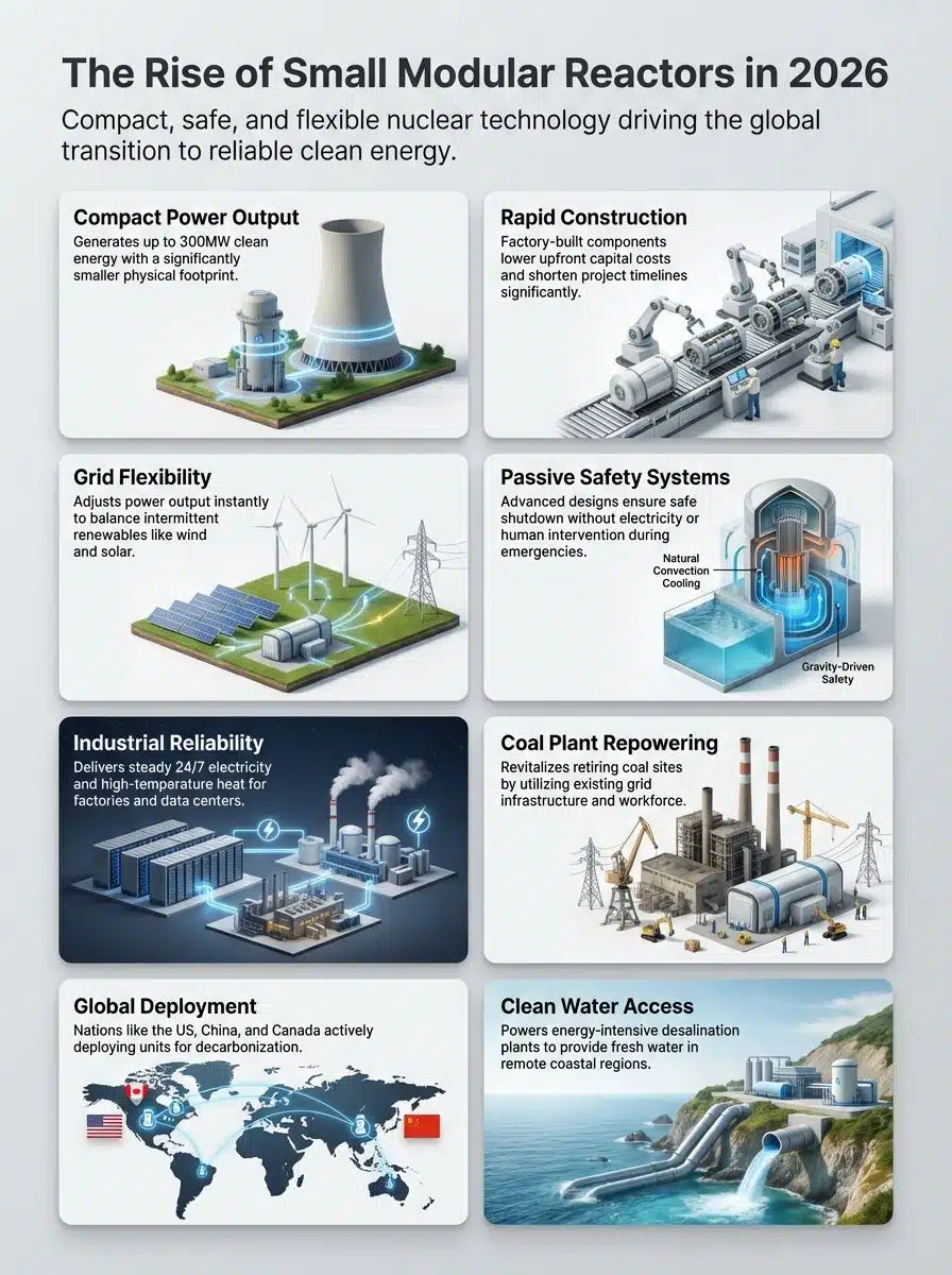 The role of Nuclear SMRs in 2026 has evolved from a promising concept to a tangible industrial reality. With construction underway in Wyoming, Tennessee, and Ontario, the technology is proving it can meet the dual demands of energy security and carbon reduction.