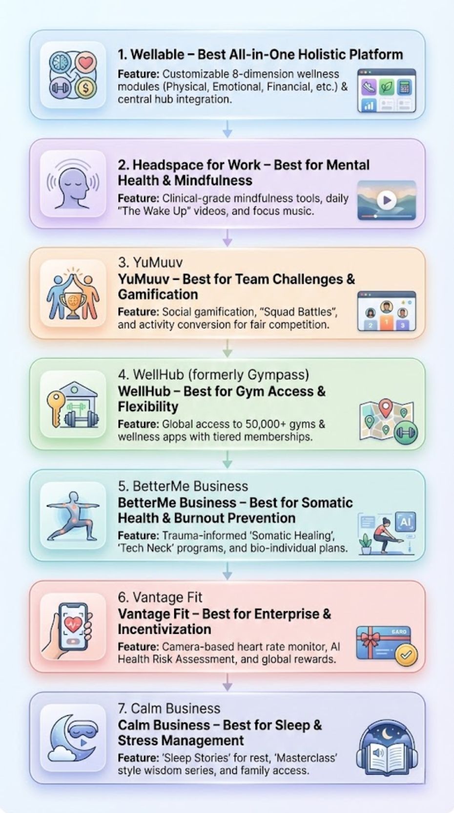 | 1. Wellable | Overall Best (Holistic) | Per employee/month | customizable 8-dimension wellness modules |