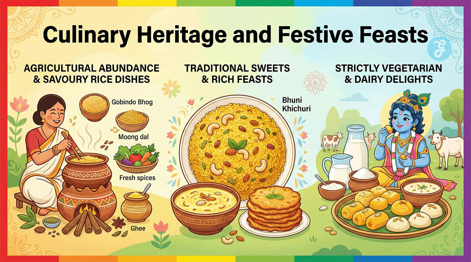 | Bhuni Khichuri | Gobindo Bhog rice, Sona moong dal, cow ghee, whole spices, turmeric. | Serves as the primary savoury offering (bhog) prepared without onion or garlic. |
