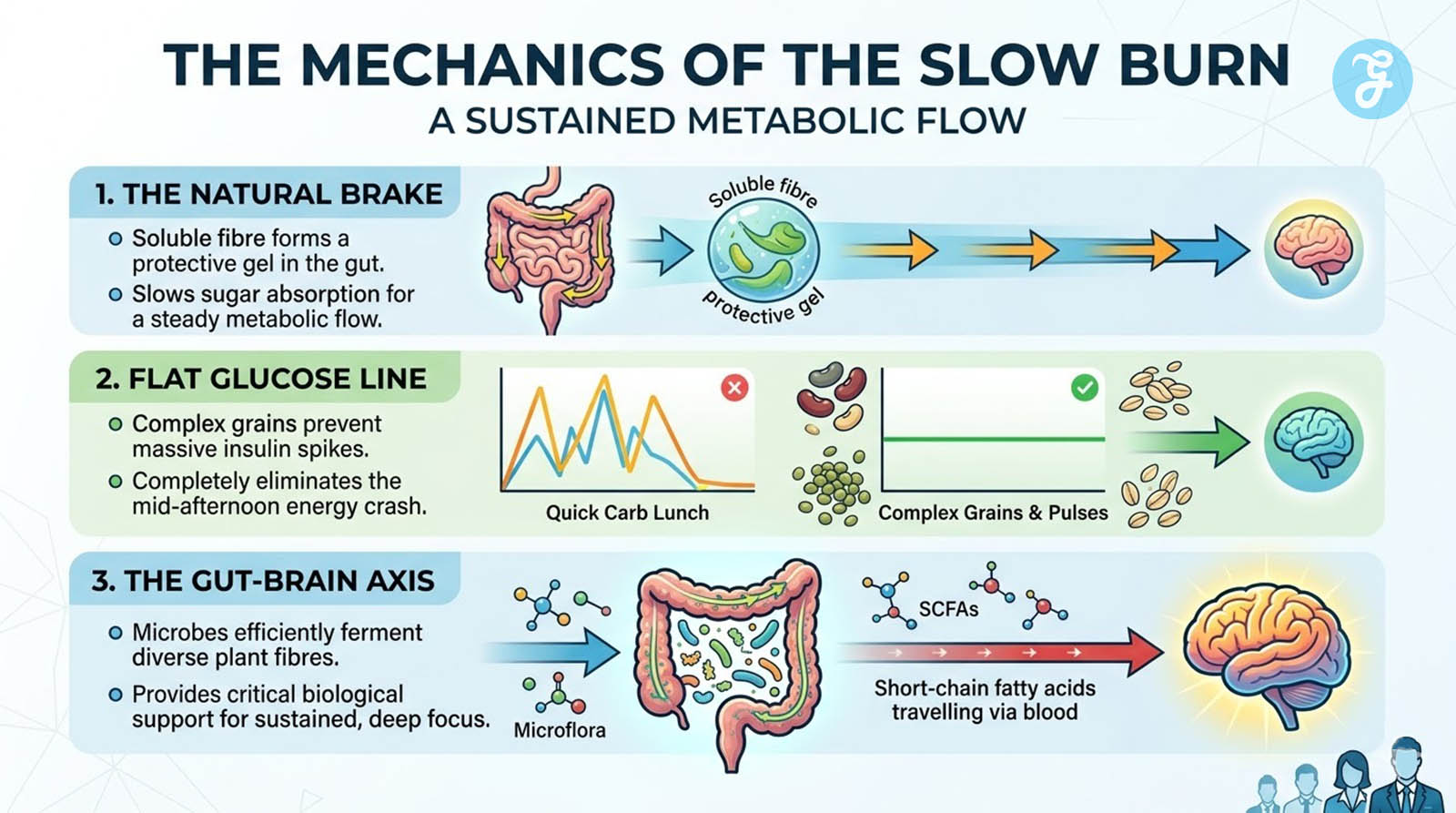 The real magic happens deeper in the digestive system. This is the gut-brain axis in action. As your microbiome ferments these plant fibres, it produces short-chain fatty acids. These compounds provide critical support for cognitive function. They help maintain the integrity of the blood-brain barrier while reducing systemic inflammation. This is why a high-fibre meal feels different. You are not just full. You are focused.