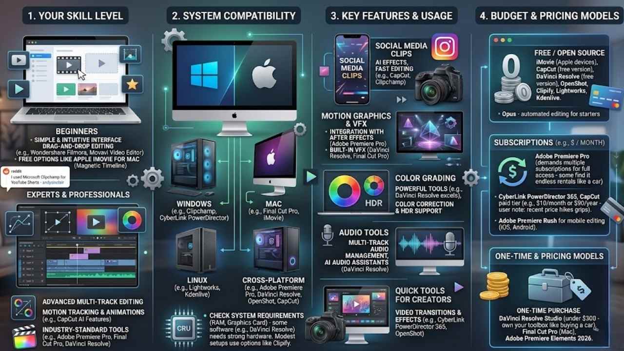 Picking video editing software feels like hunting for treasure, you know, that perfect tool that fits your style without the hassle. Consider your skill level first, say, drag-and-drop interfaces for newbies or motion tracking for experts, and match it to your computer’s setup, like Windows or Mac systems, to keep things smooth.