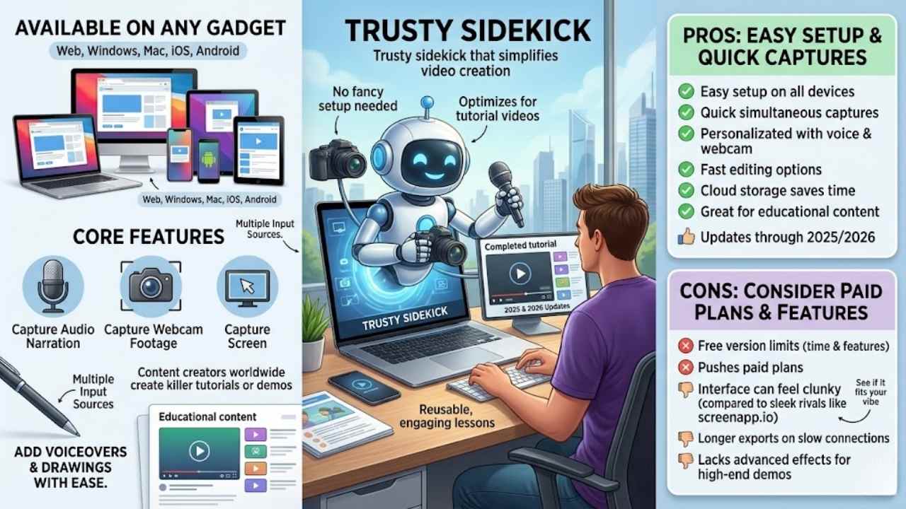 This tool shines with its easy setup on web, Windows, Mac, iOS, and Android. You get quick captures of screen, webcam, and audio all at once, like a one-stop shop for tutorials. Content creators love how it supports voice commentary and webcam footage, making demos feel personal and clear. Pros include fast editing options and cloud storage, which save time for busy folks. It works great for educational content, evolving with updates through 2025 and 2026. Imagine whipping up a tutorial in minutes, no hassle.