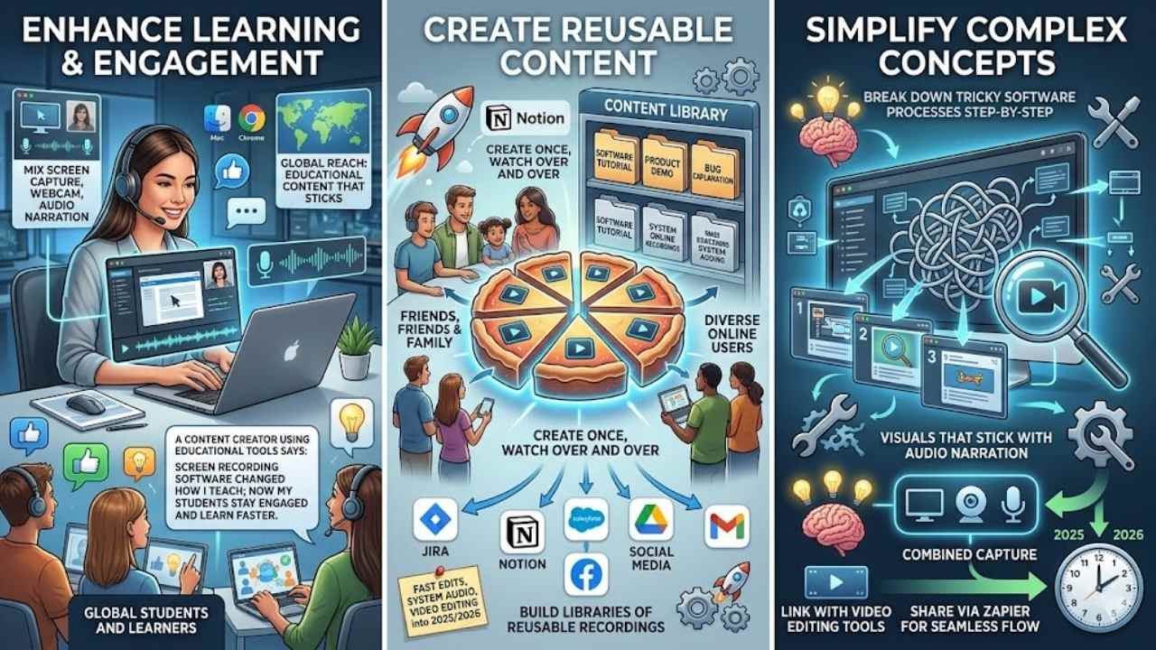 Screen recording tools boost learning by making tough ideas easy to grasp. Content creators use them to mix screen capture, webcam footage, and audio narration for full video content.