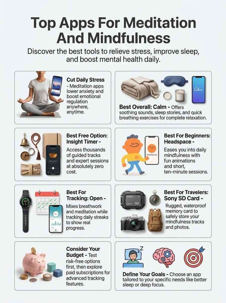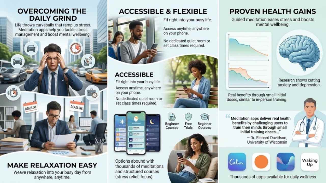 These tools fit right into your busy day, offering quick sessions that anyone can start without fancy gear. Meditation apps cut stress and boost focus, leading to real wins like less anxiety and better sleep in your life.
