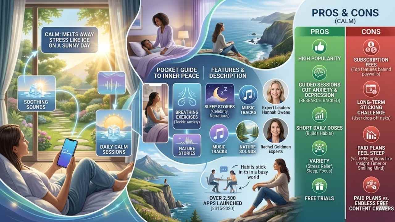 | You get free access to tons of guided sessions, plus it fits right in with health apps that mix mindfulness for stress relief, sleep help, and better focus. | Some users miss paid extras found in apps like Calm, which top charts for popularity. |