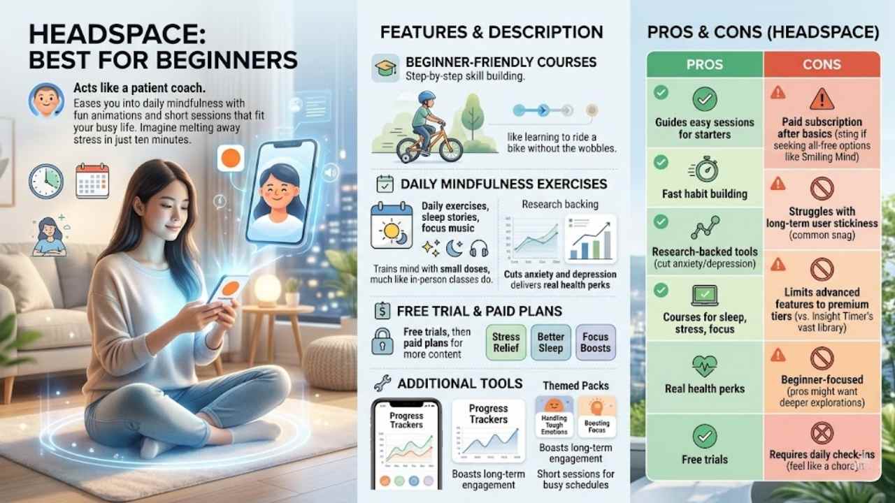 New to meditation? Headspace acts like a patient coach, easing you into daily mindfulness with fun animations and short sessions that fit your busy life. Imagine melting away stress in just ten minutes, as its voice-guided exercises build your skills step by step, sparking that inner peace you’ve been craving.