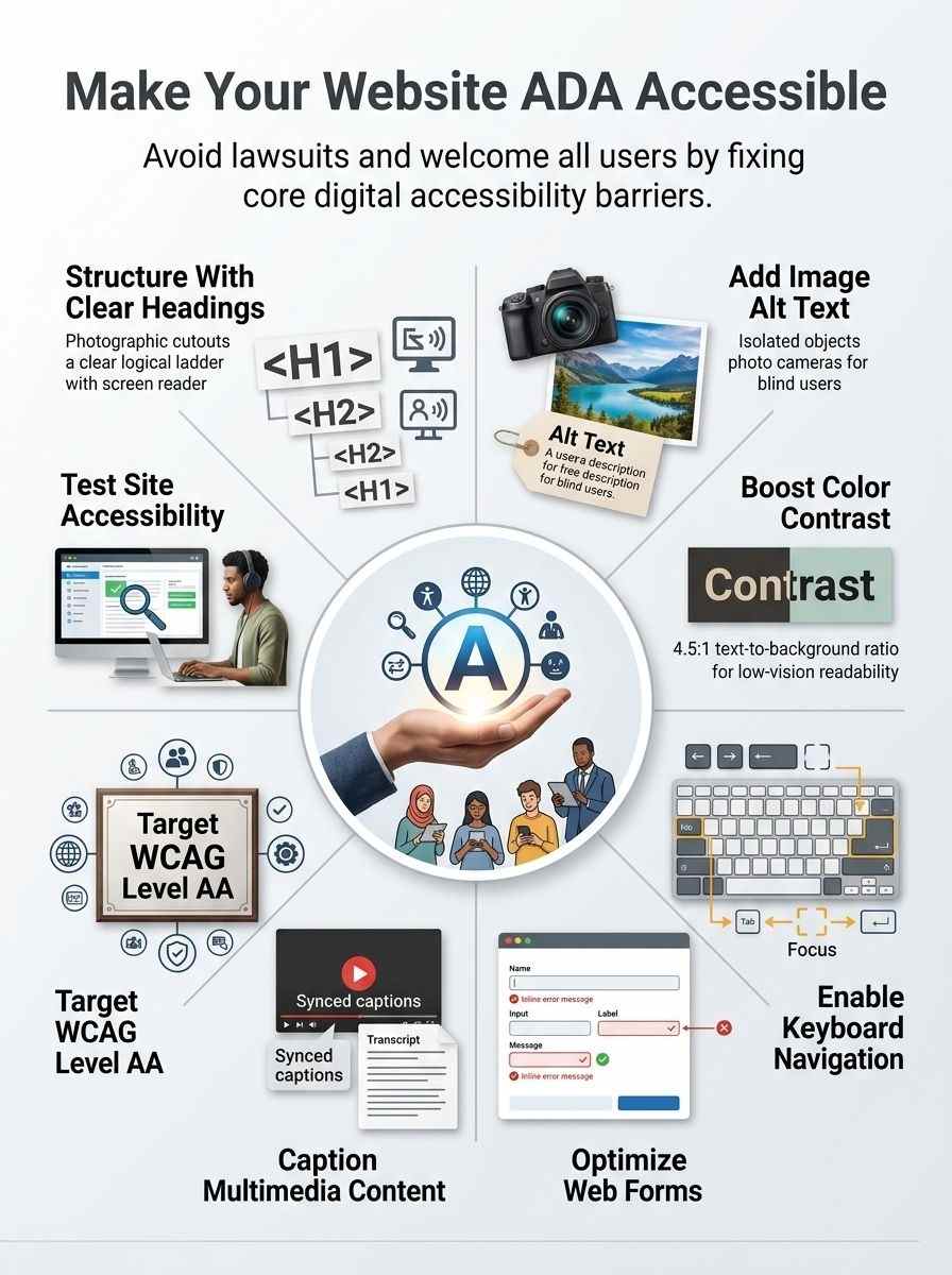 Picture your website as a welcoming front door that everyone can open, no matter their abilities. Dive right in with these key steps, like adding alt text to pictures and fixing color contrasts, to keep visitors coming back for more.