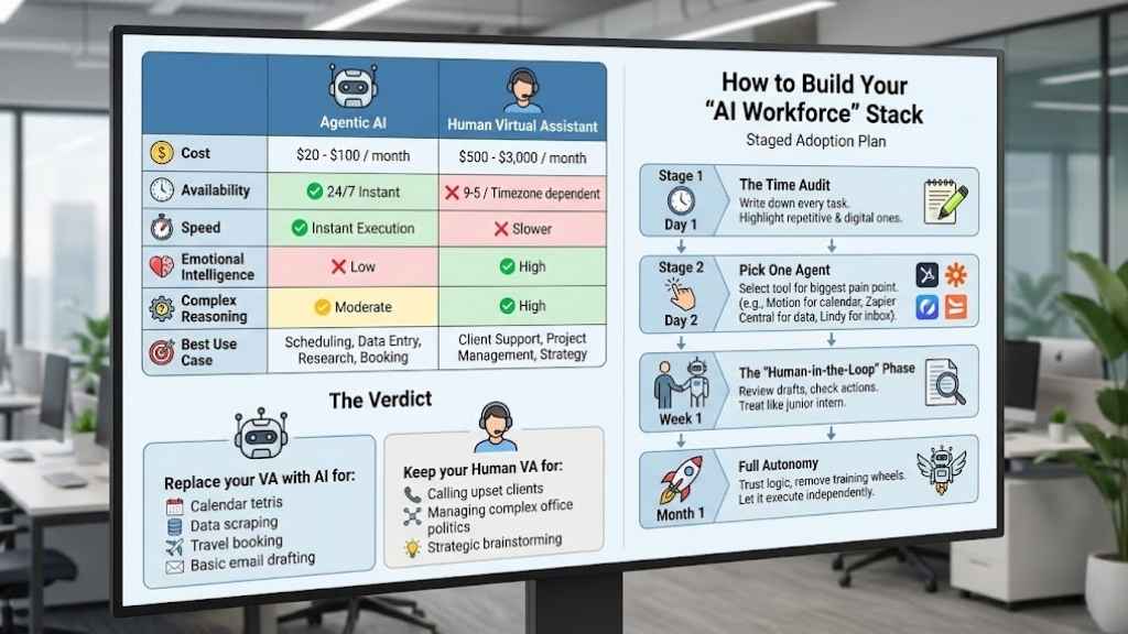 - Keep your Human VA for: Calling upset clients, managing complex office politics, and strategic brainstorming.