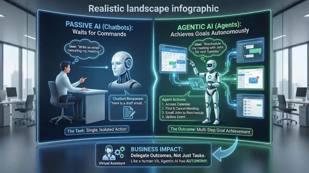 - Passive AI (Chatbots): You ask a question, it gives an answer. It waits for you. (e.g., “Write an email canceling my meeting.”)