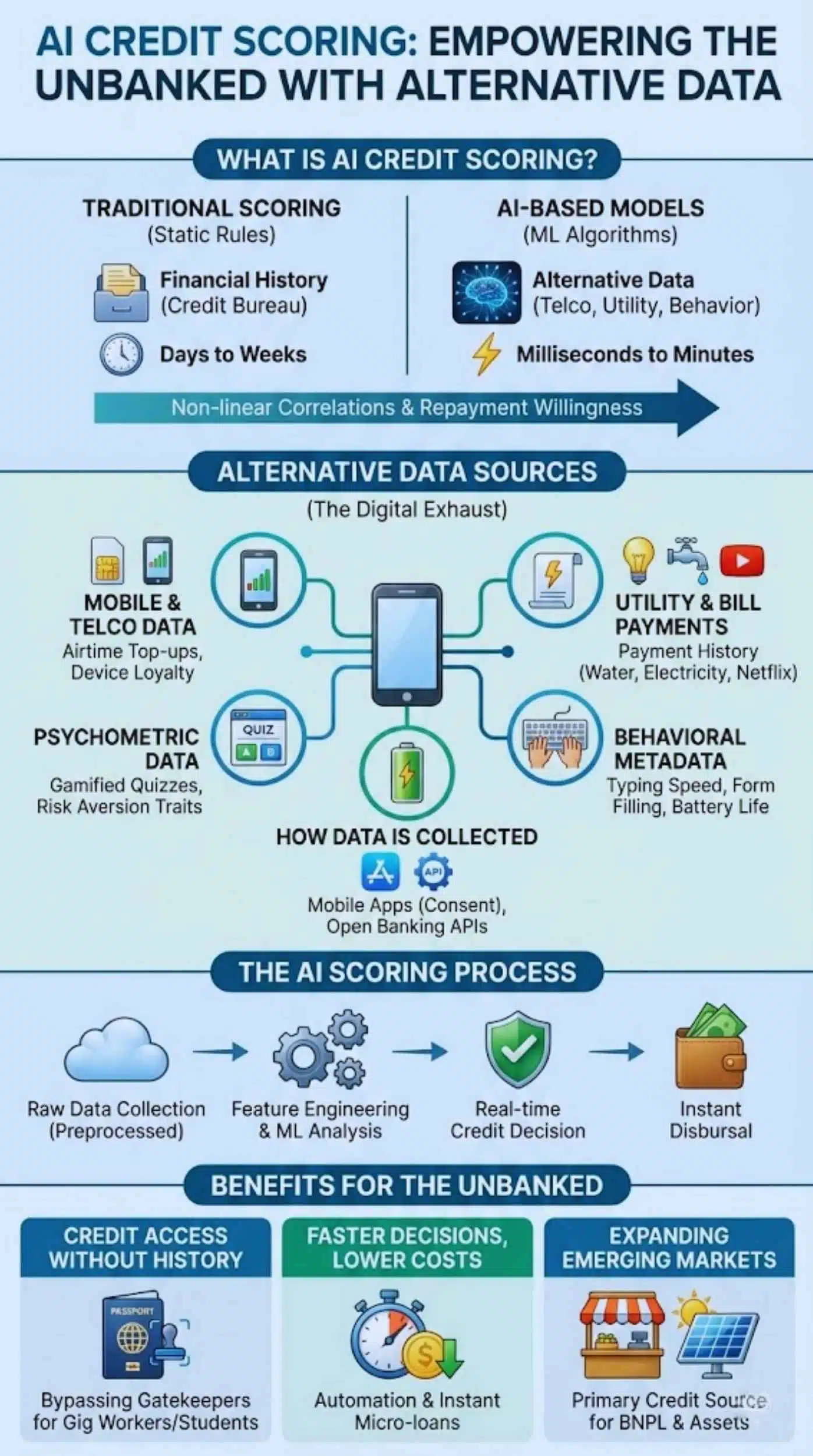- The Solution: AI Credit Scoring uses alternative data (telco, utility, behavior) to predict trustworthiness without traditional history.