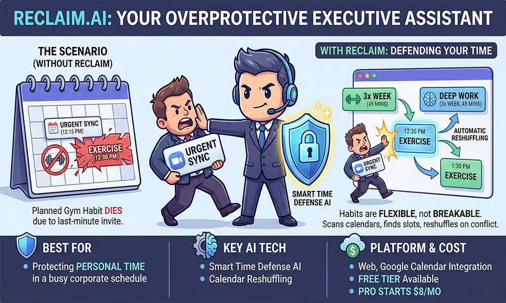| Time Management | Reclaim.ai | Protecting personal habits in a busy corporate schedule. |
