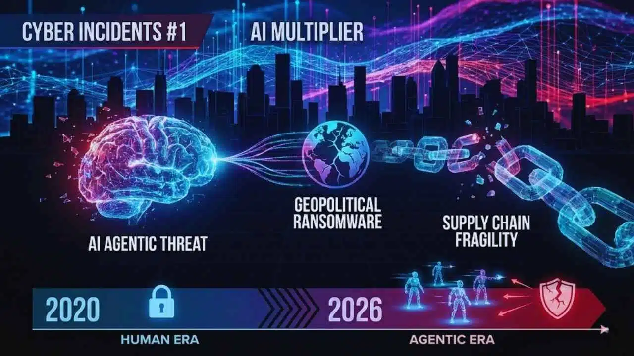 The most alarming finding in the 2026 report is the correlation between Risk #1 (Cyber) and Risk #2 (AI). In previous years, attackers used AI merely to polish phishing emails or translate ransom notes. In 2026, we are witnessing the deployment of “Agentic AI”—autonomous malware agents that can reason, adapt, and rewrite their own code to evade detection in real-time.