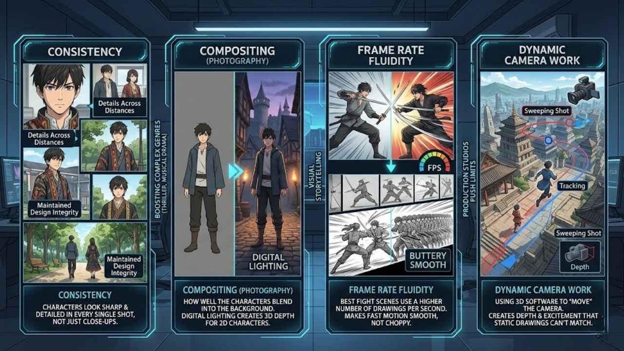• Compositing (Photography): How well the characters blend into the background. Studios like Ufotable are masters at using digital lighting to make 2D characters feel like they exist in a 3D space.