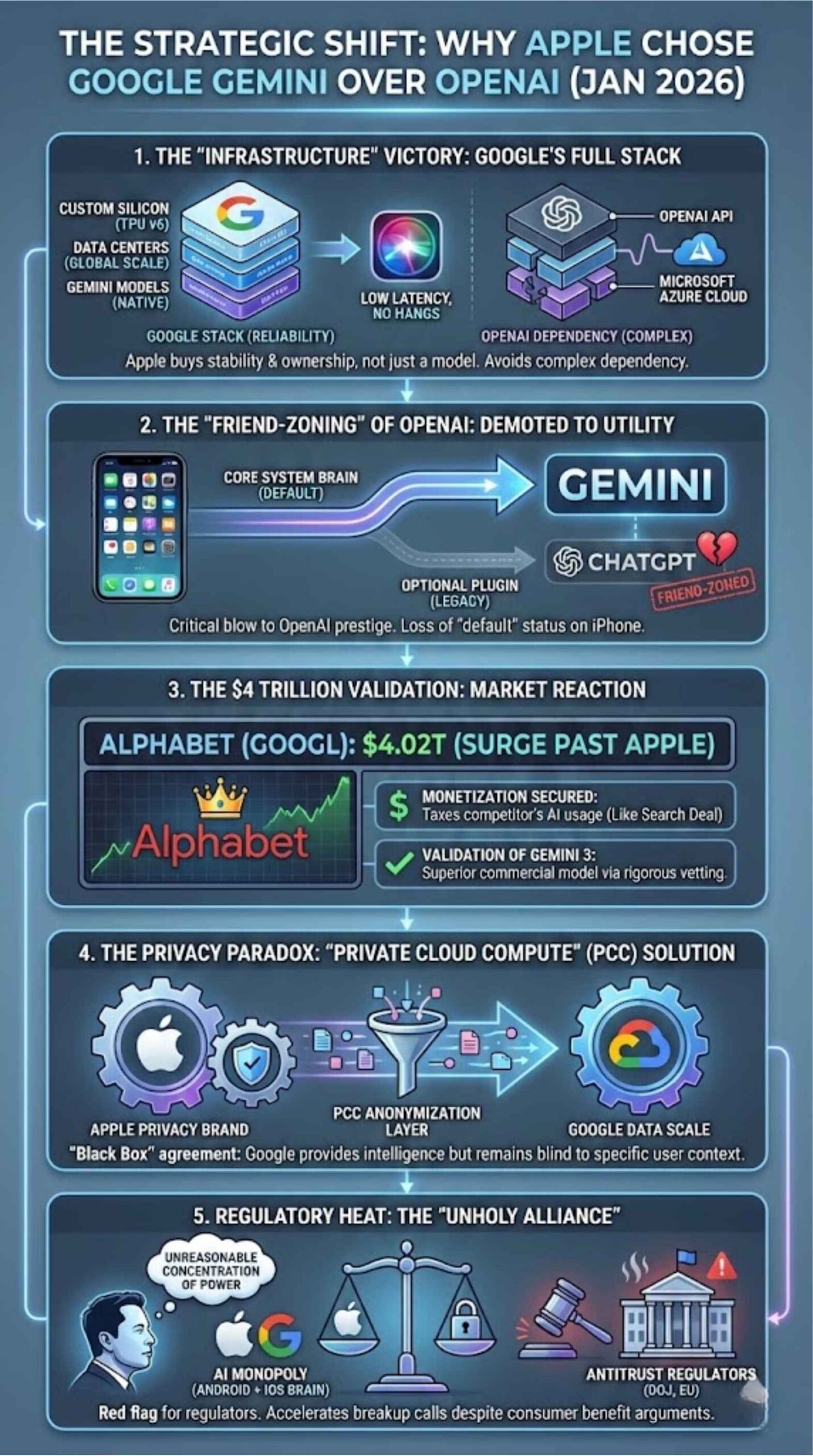 In a landmark January 2026 move, Apple has officially selected Google’s Gemini as the foundational intelligence for its next-generation Siri, sidelining early partner OpenAI. This multi-year, multi-billion dollar agreement doesn’t just rescue Apple’s delayed AI roadmap; it reshapes the Silicon Valley hierarchy, propelling Alphabet to a $4 trillion valuation and signaling a mature phase of “pragmatic AI” where infrastructure and scale trump first-mover advantage.