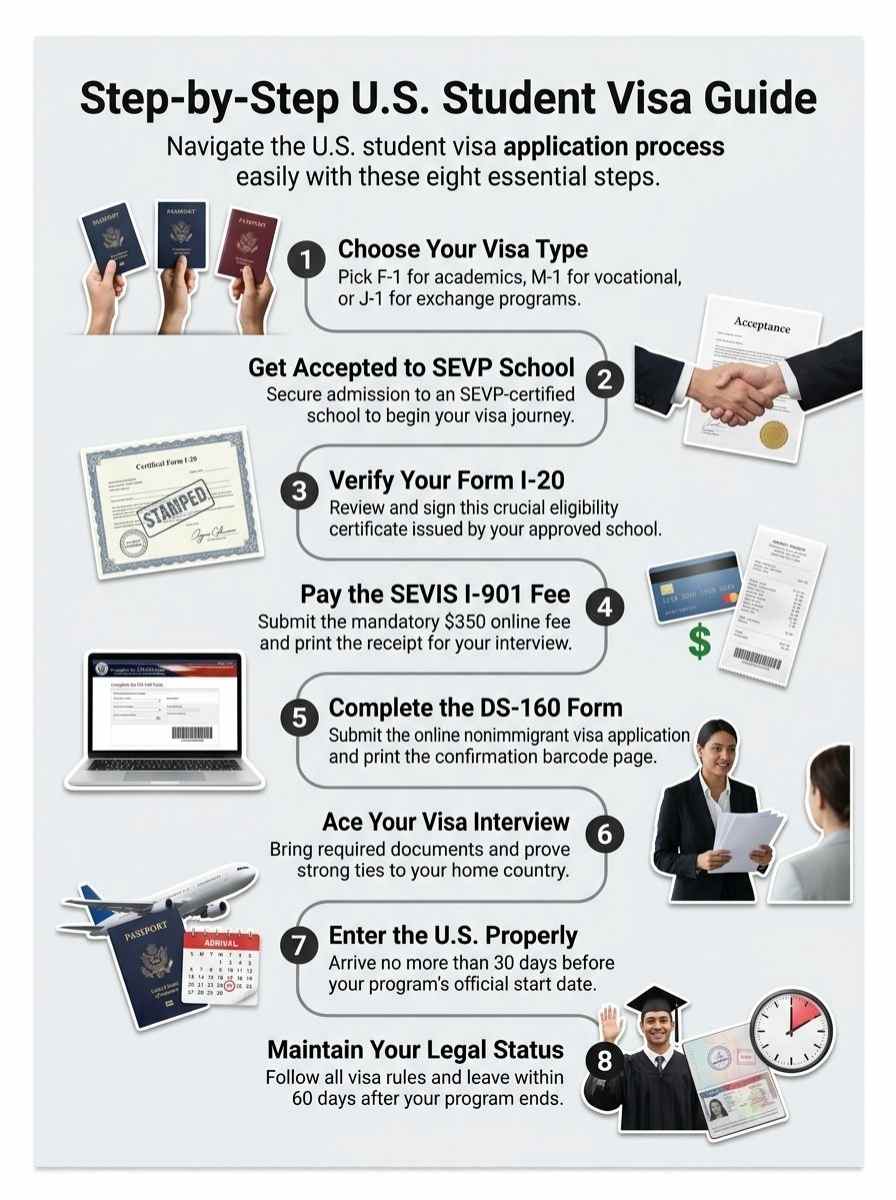 This guide explains how to apply for a student visa step by step—from choosing a SEVP-certified school and receiving Form I-20 to paying the I-901 SEVIS fee. It also covers completing Form DS-160, scheduling the visa interview, and avoiding common mistakes.
