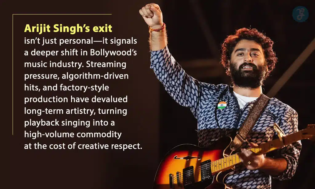 Singh’s announcement did not arrive in isolation. It came at a time when India’s film music ecosystem is quietly recalibrating under the weight of streaming dominance, compressed production timelines, and a narrowing definition of commercial success. Playback singing, once built on long-term creative partnerships, now often functions as a high-volume, low-risk enterprise driven by algorithms and release calendars. Against this backdrop, the Arijit Singh exit reads less like a personal rupture and more like a moment that reveals how the industry itself has changed.