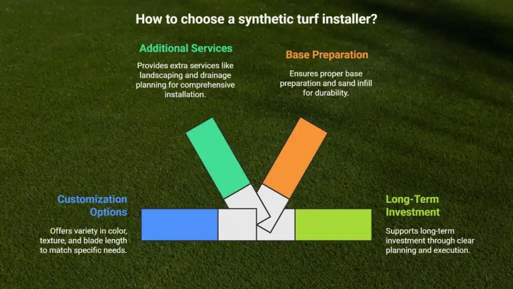 Pick a turf installer that offers choices in color, texture, and blade length. Ask about pile height for backyard cricket pads. Check if they add landscaping and edging. Confirm they walk you through base preparation and sand infill steps.