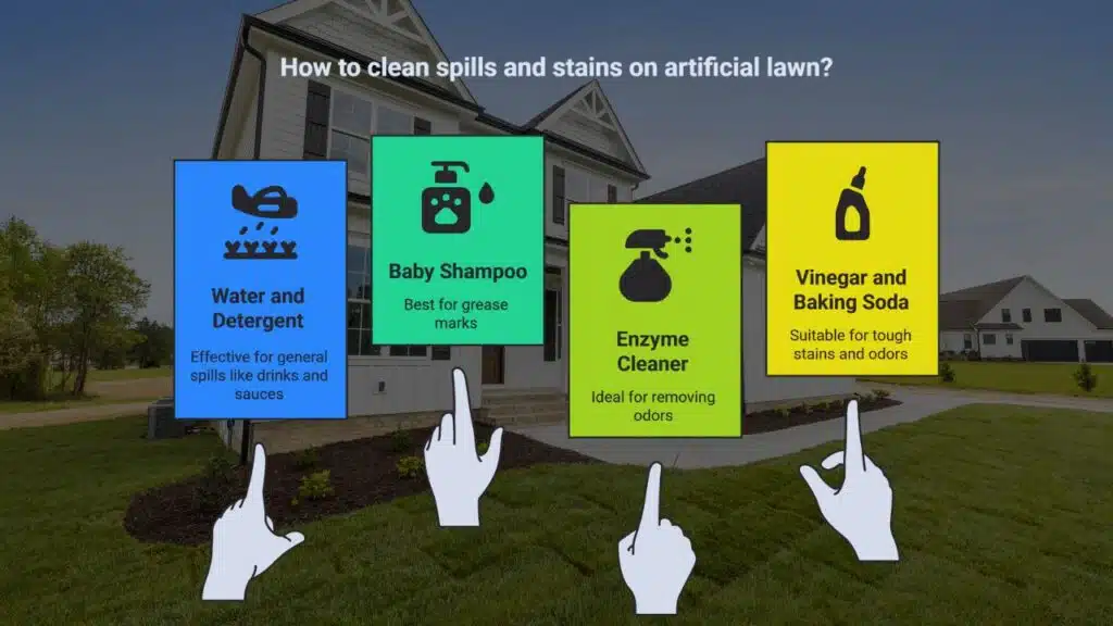 Spills on your artificial lawn need a quick fix to stay spotless. Use a garden hose, warm water, and a bit of detergent to flush away drinks or sauces. Grease marks respond well to a dab of baby shampoo mixed in warm water.