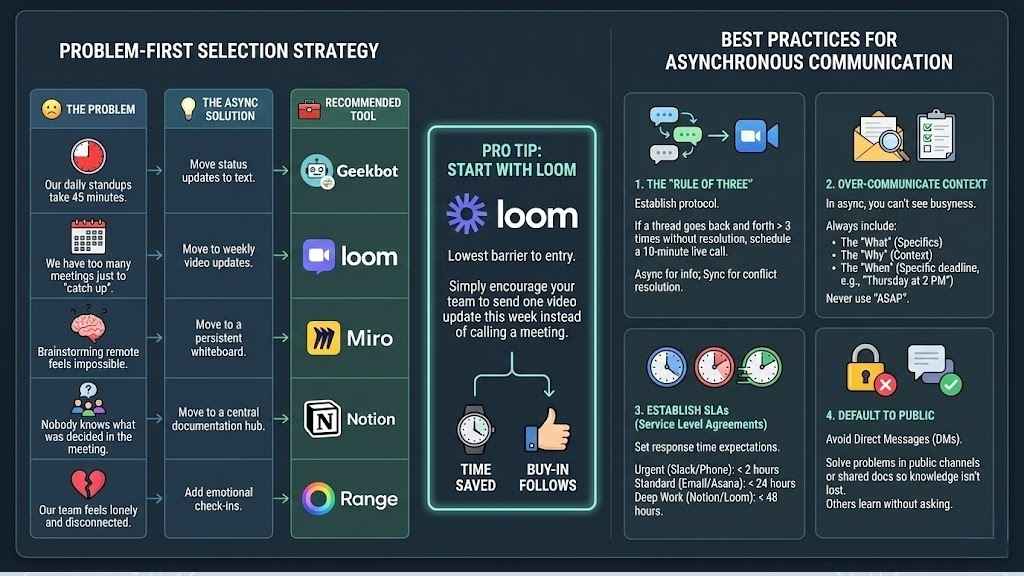 Pro Tip: Start with Loom. It has the lowest barrier to entry. Simply encourage your team to send one video update this week instead of calling a meeting. Once they see the time saved, buy-in for other tools will follow.