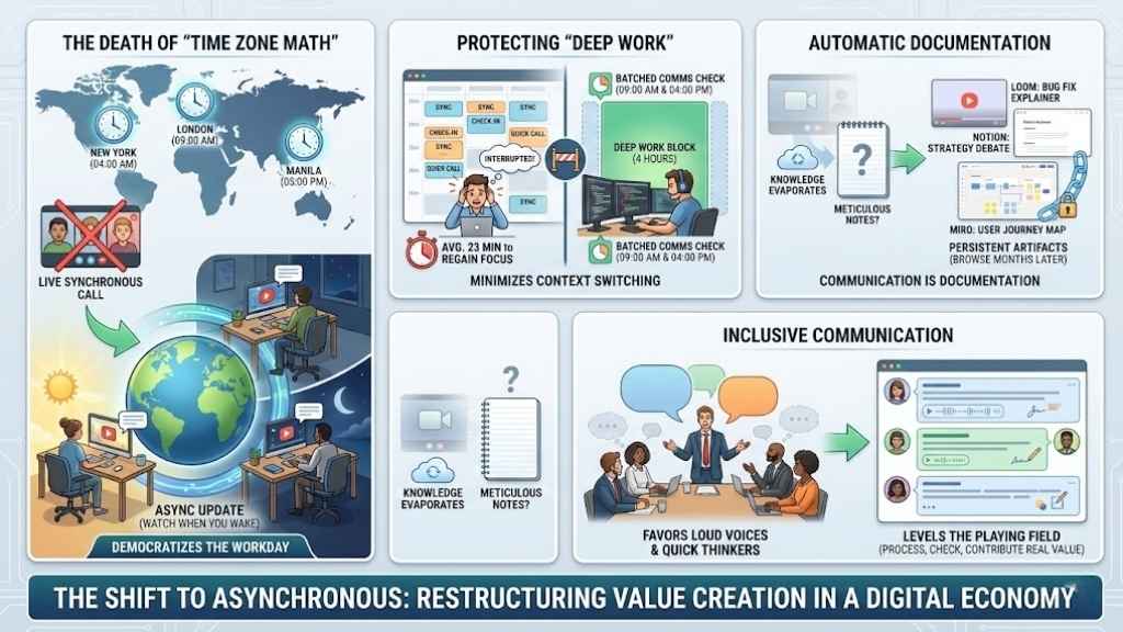 Before we dive into the software, it is critical to understand why this shift is necessary. Asynchronous work isn’t just about disliking video calls; it is about fundamentally restructuring how value is created in a digital economy.