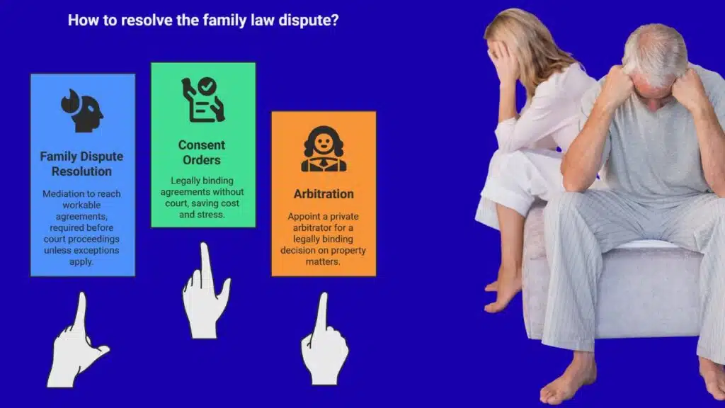 Property disputes can also be resolved through arbitration, a process recognised under Part III, Division 4 of the Family Law Act. Arbitration allows parties to appoint a private arbitrator whose decision, the award, is legally binding.