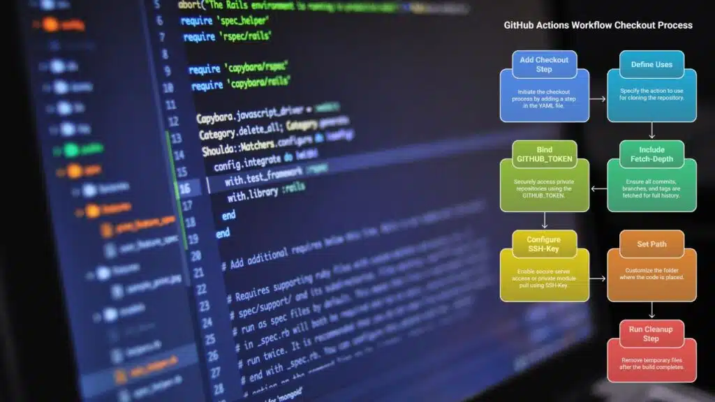 Your YAML file lives in .github/workflows, guiding each step like a recipe card for GitHub Actions. Add actions/checkout@v3, run the JS runtime setup, drop in secrets.github_token, and watch CI/CD deploy your site.