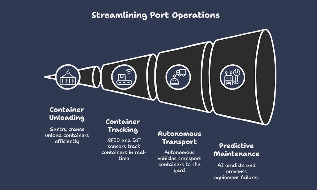 Autonomous vehicles power cranes and trucks. They streamline container loading and unloading at ports. Robotics arms lift boxes with AI and machine vision. IoT sensors track weight and location in real time.