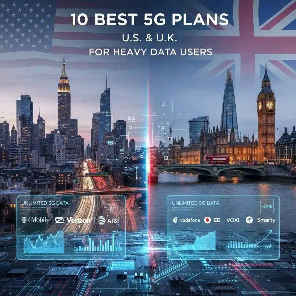 That’s where the 10 Best 5G Plans for Heavy Data Users in the U.S. & U.K. come in. This review walks through the strongest options on both sides of the Atlantic. We look at data limits, premium data, 5G coverage, hotspot caps, roaming, pricing, and everyday user experience. You’ll see exactly which plans make sense for streamers, remote workers, gamers, and people who live online.