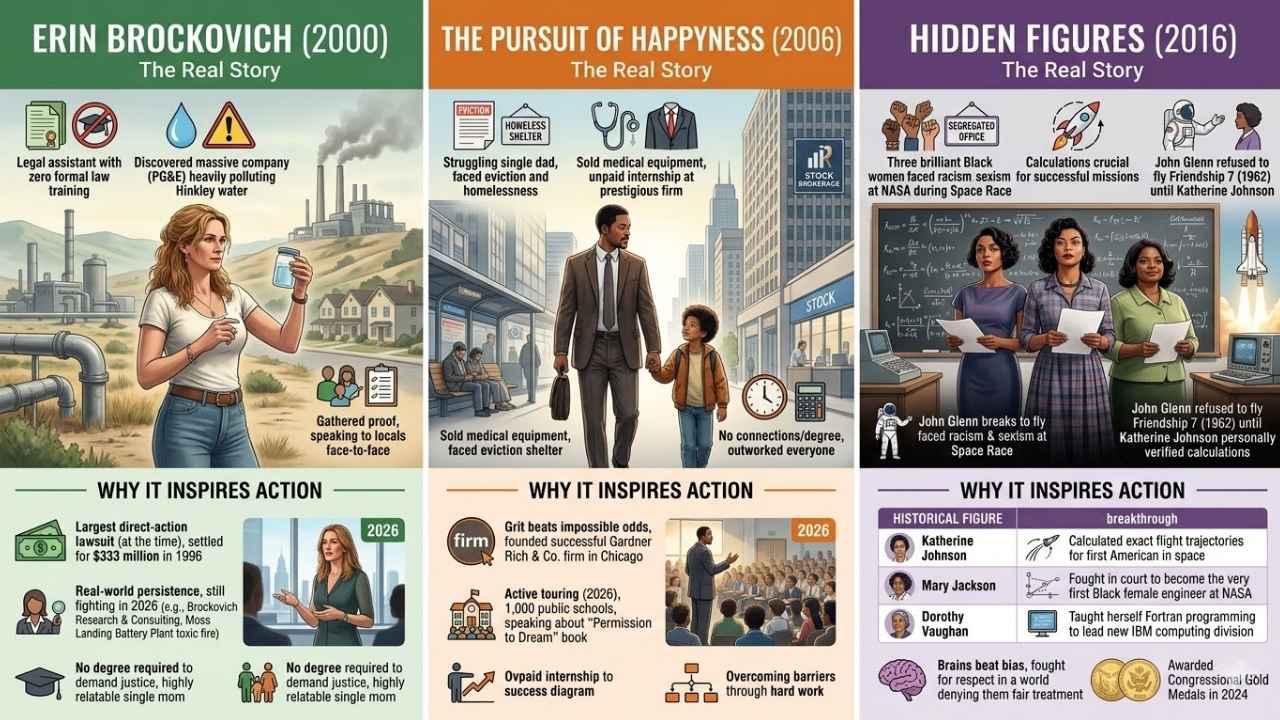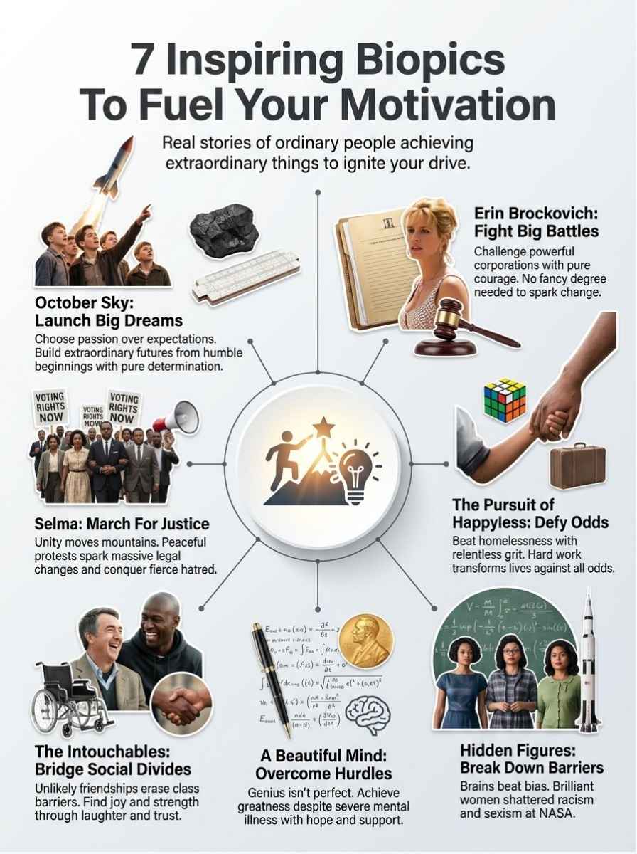 Films like Erin Brockovich, The Pursuit of Happyness, and Hidden Figures prove that true stories hold incredible power. Each one offers a powerful example of facing difficult moments with courage and determination.  These biographical films are among the seven best biopics to watch for inspiration today. They highlight perseverance, resilience, and the ability to find hope even during challenging times.