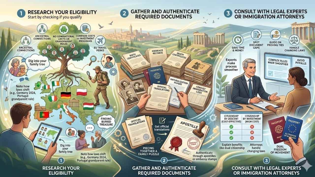 Dreaming of that second passport from your family tree, huh, like finding buried treasure in grandma’s attic? Start by digging into your roots with birth certificates and marriage records, then chat with a lawyer who knows the ropes on consular applications to make the process smooth as butter.