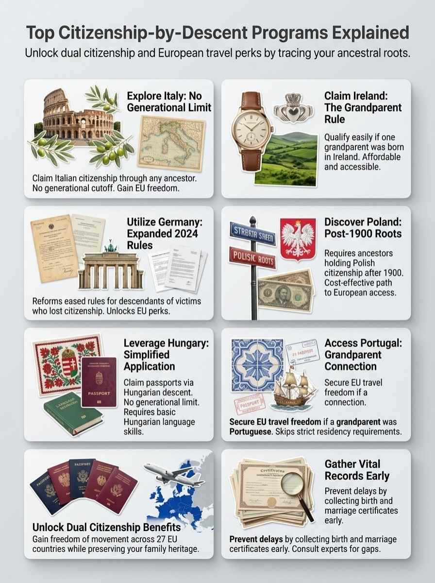 - Dig into your family tree to spot ties to countries like Italy, Ireland, or Germany, where citizenship by descent lets you gain a passport based on ancestral connections, often without generational limits or with grandparent rules.