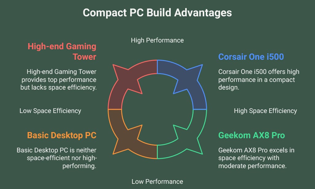 - Compact PCs like the Geekom AX8 Pro, sized at 4.6 x 4.37 x 1.51 inches, save space and fit tiny desks.