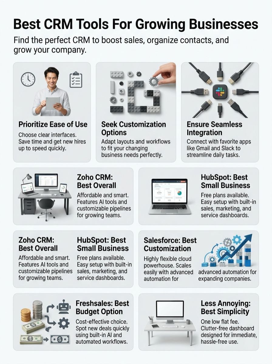 Each platform we reviewed brings something valuable to the table for your team. Whether you choose the huge feature list of Zoho or the friendly design of HubSpot, you are making a smart move. The best CRM tools for growing businesses compared here will help you focus on your buyers. Take a look at a few free trials and see which one feels right for you!