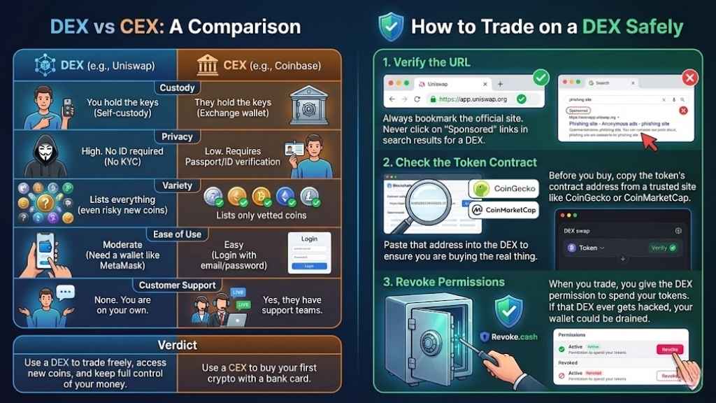 Verdict: Use a CEX to buy your first crypto with a bank card. Use a DEX to trade freely, access new coins, and keep full control of your money.