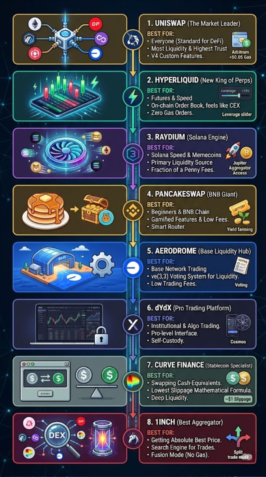 If you are a high-frequency trader looking for the next breakout token on Solana, Raydium is your undisputed home. For those prioritizing institutional-grade security and deep liquidity for major assets like ETH and WBTC, Uniswap remains the gold standard. Meanwhile, sophisticated traders seeking leverage without the risk of a centralized exchange collapse have found a robust haven in Hyperliquid.