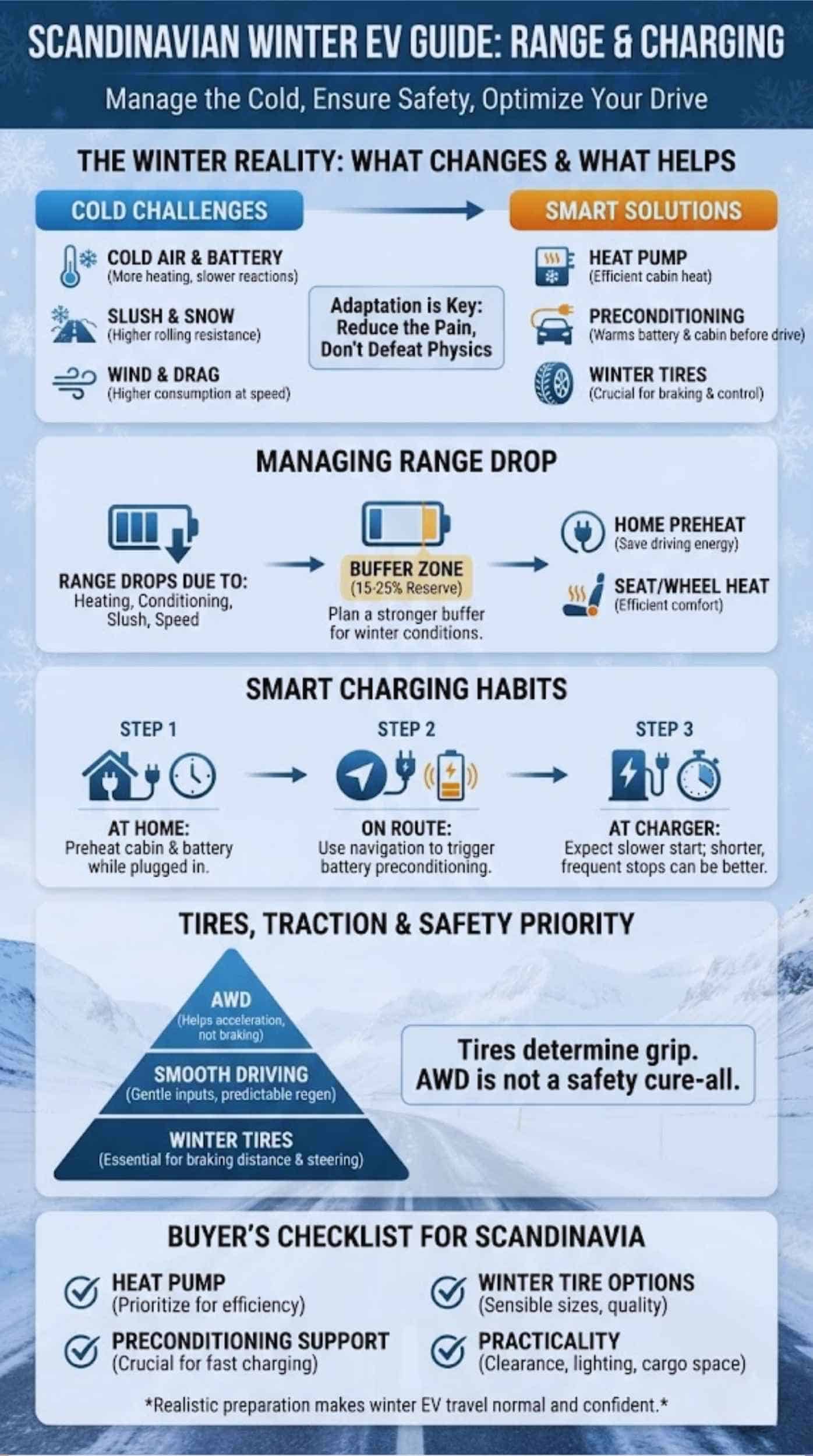 Choosing the right EV for a harsh Scandinavian winter is about matching features to real life. You want stable traction, efficient heating, and a battery that can prepare itself for fast charging. You want good defrosting and visibility in darkness and wet cold. You also want practical space for winter routines, from boots to skis.
