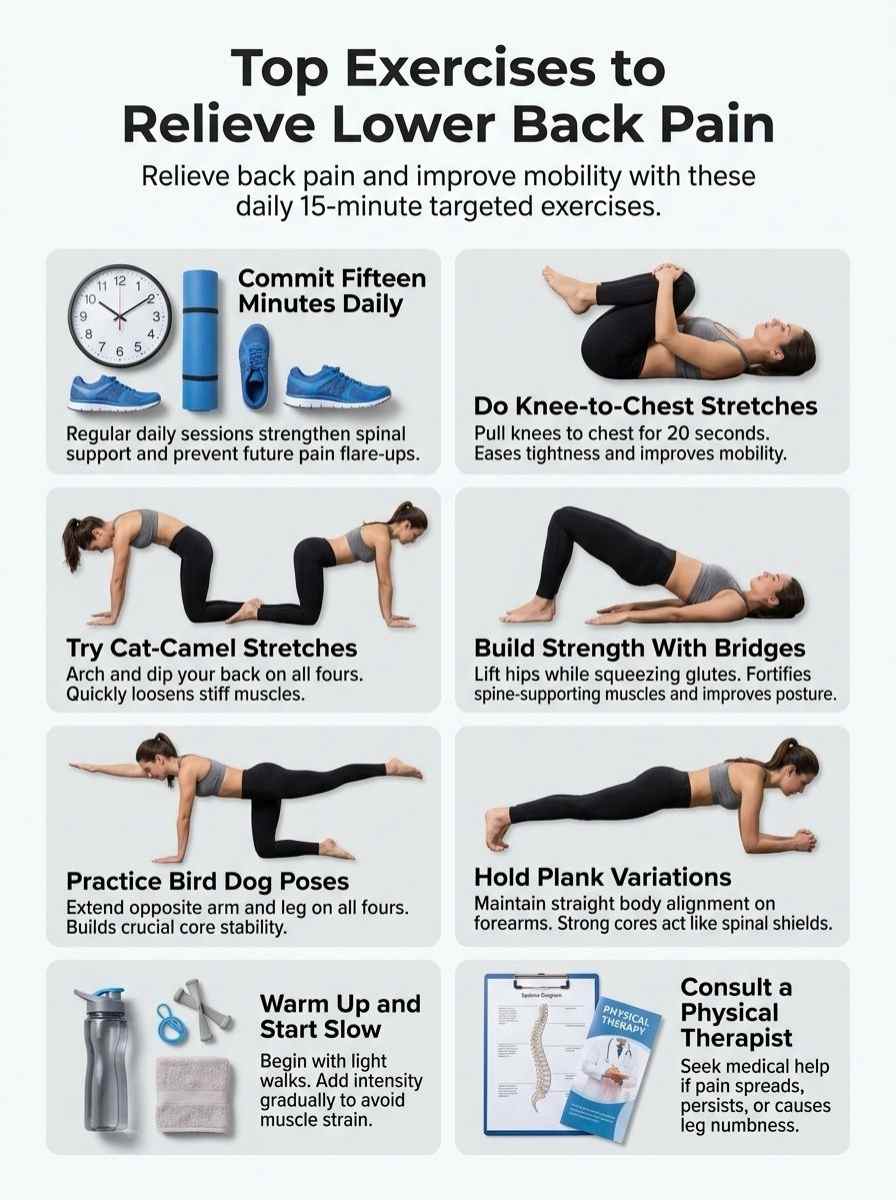 Exercises for Lower Back Pain can help reduce discomfort and prevent future issues when done consistently. Expert-backed routines include gentle stretches like the knee-to-chest stretch and strengthening moves such as the bridge exercise to support abdominal muscles and glutes.