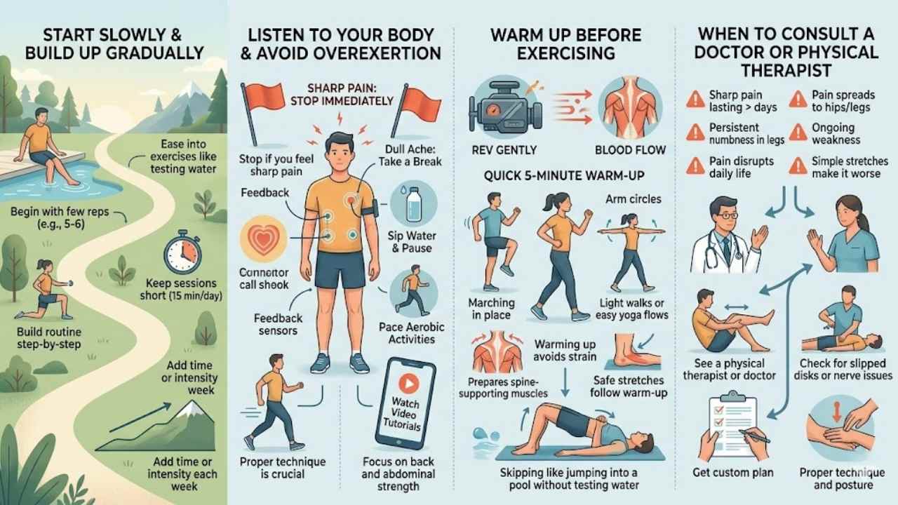 Physical therapists recommend starting slowly and progressing gradually. Persistent pain linked to conditions like herniated discs or spinal stenosis should be evaluated by a healthcare professional.