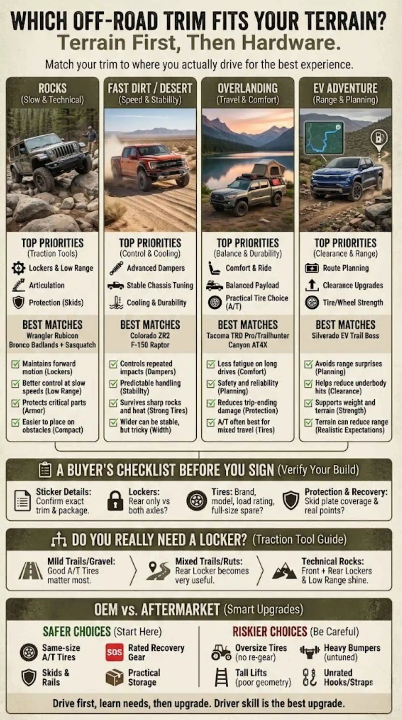 This guide is built for buyers who want real function. That means traction hardware, serious suspension tuning, underbody protection, and tires that can take abuse. You will also see the tradeoffs, because no factory off-road trim is perfect for every driver.