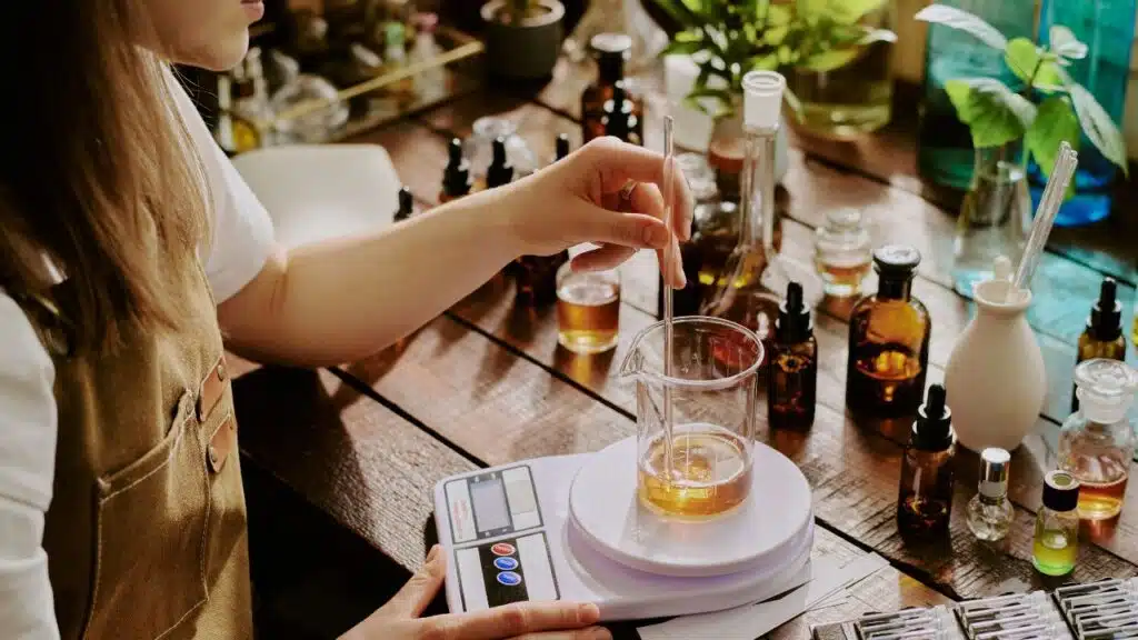 Artisan perfumers use a digital scale and glass pipette to nail each batch. They burn a wooden wick and note how fragrance layering and perfume layering mesh with a pinch of pink pepper.