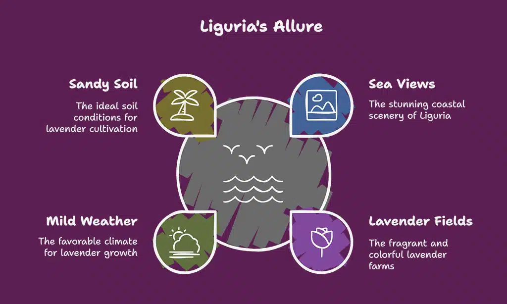 - Liguria combines sea views with nearby lavender farms, growing best from June to July due to sandy soil and mild weather.