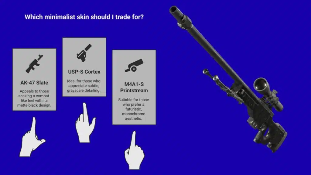 Minimalist skins in CS2 aren’t about hiding; they’re about signaling control. Whether it’s the AWP Graphite Factory New, an AK Slate, or a Printstream, these weapons show that restraint can be more powerful than flash.
