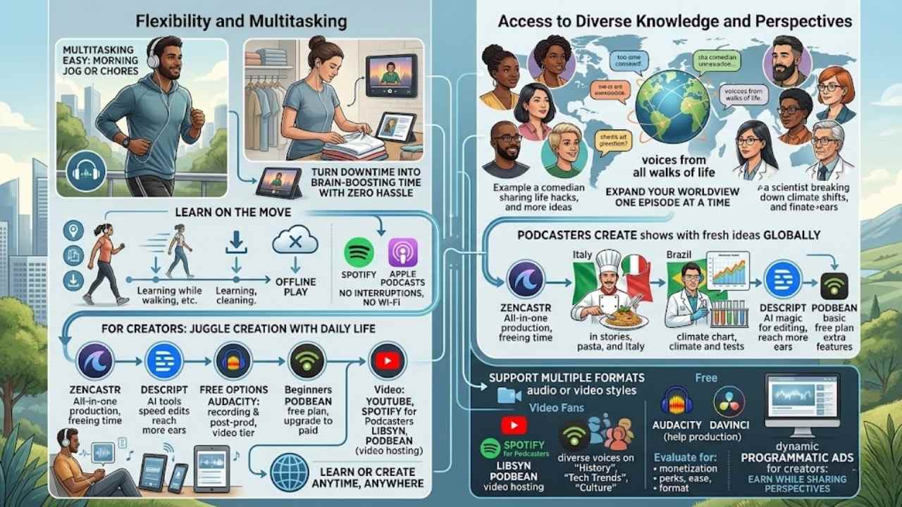 Audio learning slides right into your packed schedule. You grab knowledge on the move, like during a walk or chores. Platforms such as Spotify and Apple Podcasts let you download episodes for offline play.