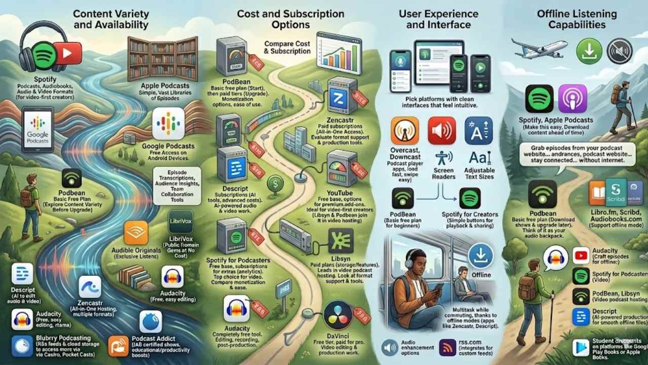 We cover content variety, costs, user-friendly interfaces, and offline listening. Plus, we touch on podcast hosting options like Podbean and Buzzsprout for creators. You’ll find tips on audio quality, subscription models, and even free apps for college students.
