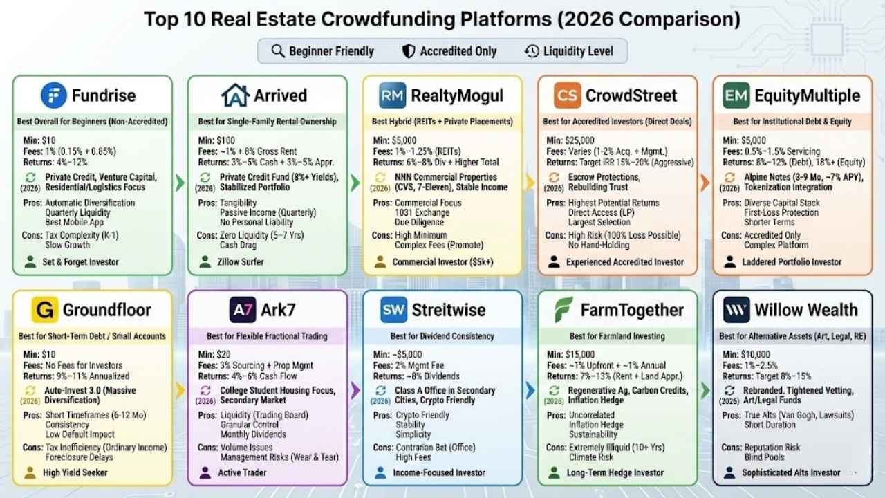 This guide ranks the 10 best real estate crowdfunding platforms based on current 2026 performance, fees, liquidity, and safety.